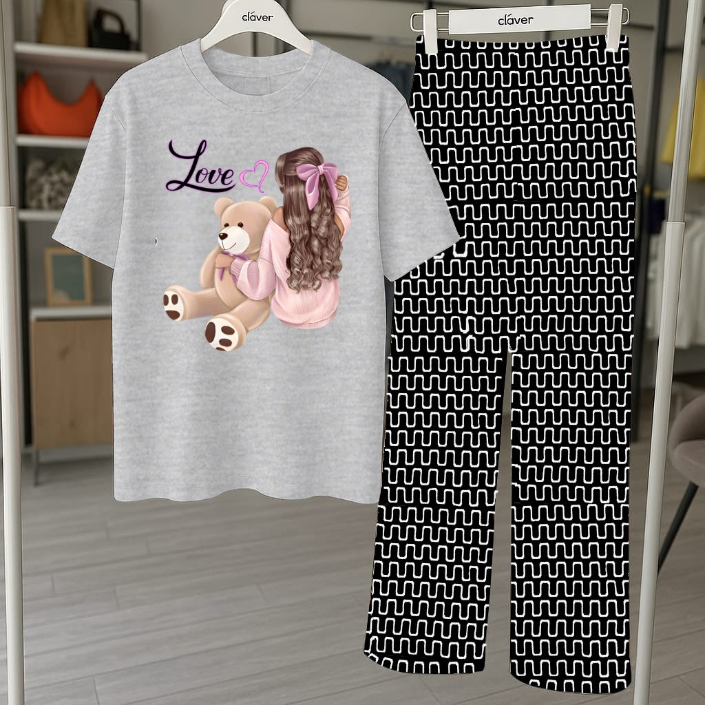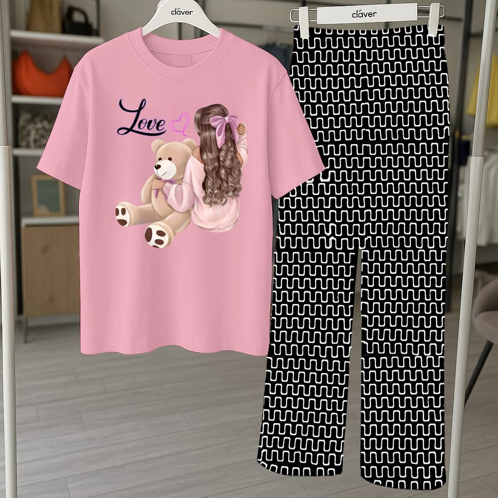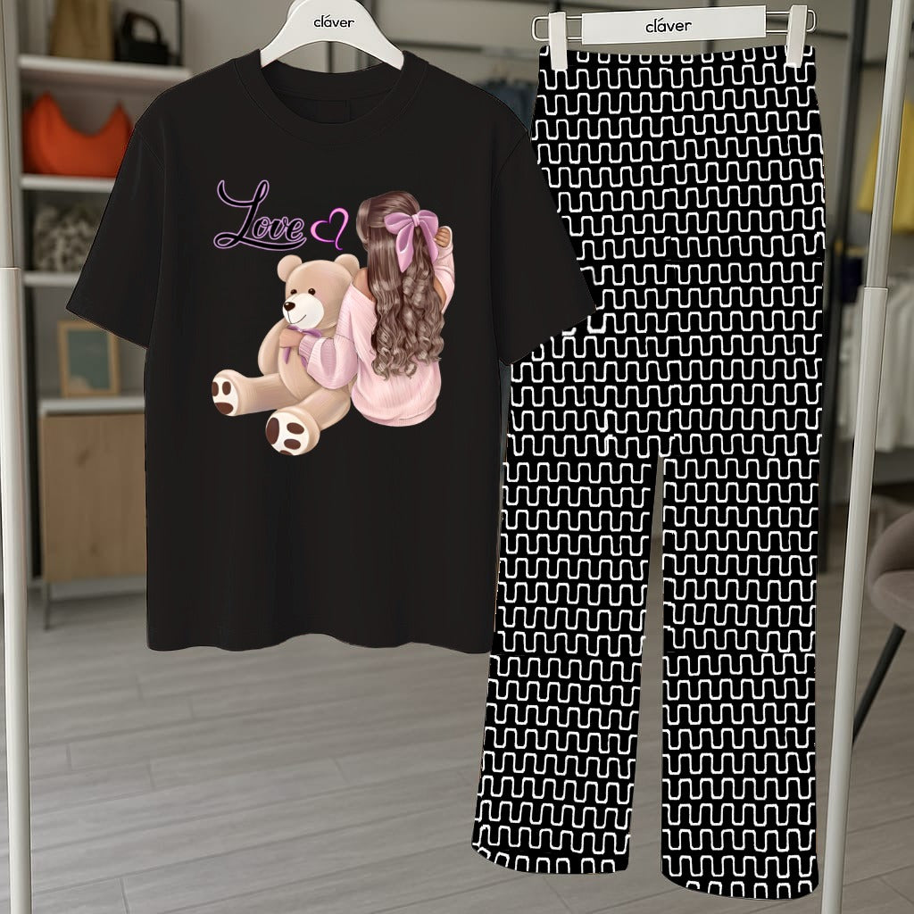 Cute Teddy Bear Graphic Pajama Set - Printed Tee and Abstract Pattern Pants