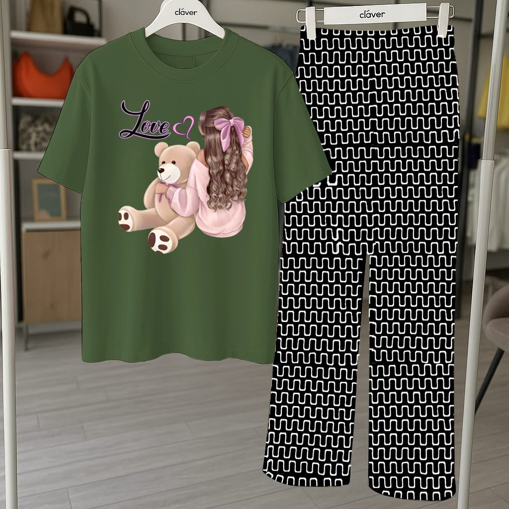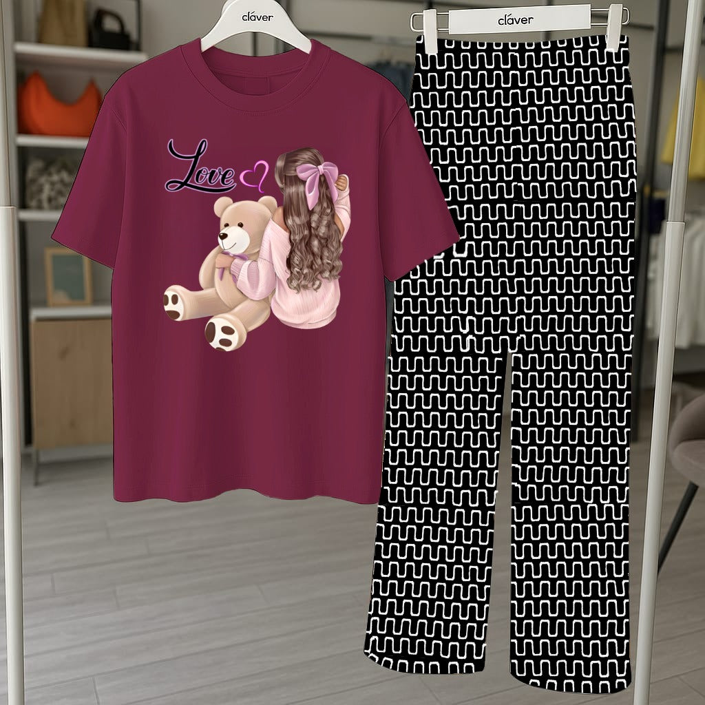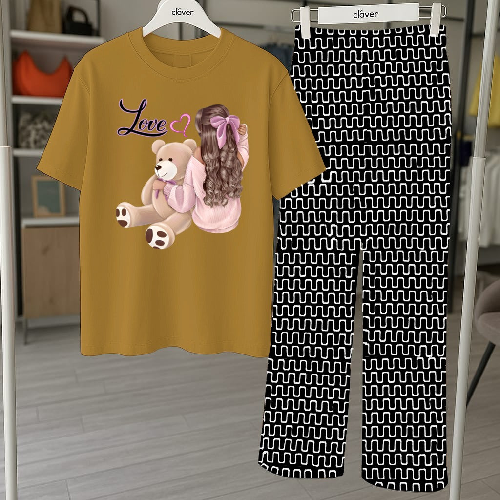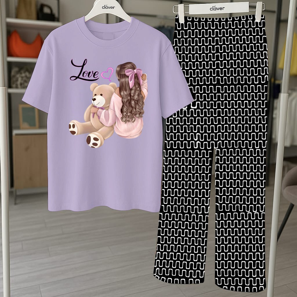 Cute Teddy Bear Graphic Pajama Set - Printed Tee and Abstract Pattern Pants